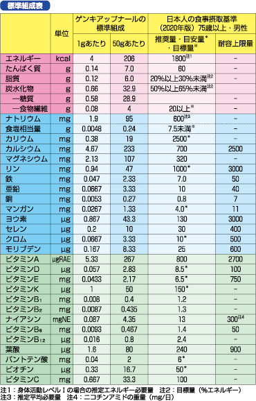 A通常のお食事と合わせて計算し、栄養補助として適量を加えてください。 例えば、ゲンキアップナールにはたんぱく質が含まれますので、腎障害をお持ちの方は摂り過ぎにご注意ください。