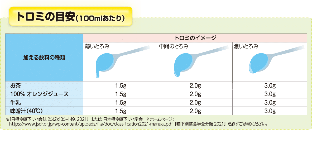 A濃厚流動食や栄養補助飲料に対してはトロミがつくのに時間がかかります。(成分が異なる為)所要時間は濃厚流動食の種類によって異なります。最初の溶解後、10分ほど静置し、再度よくかき混ぜてください。
